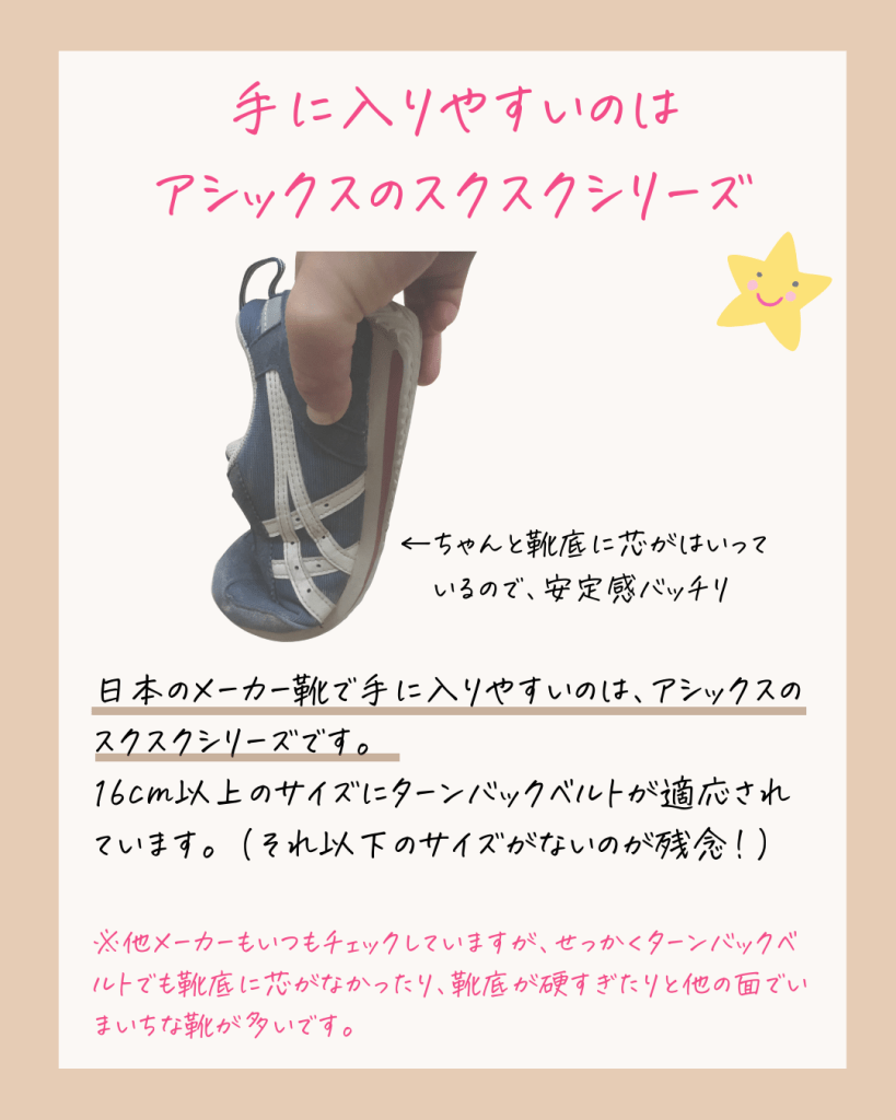 日本のメーカー靴で手に入りやすいのは、アシックスのスクスクシリーズです。